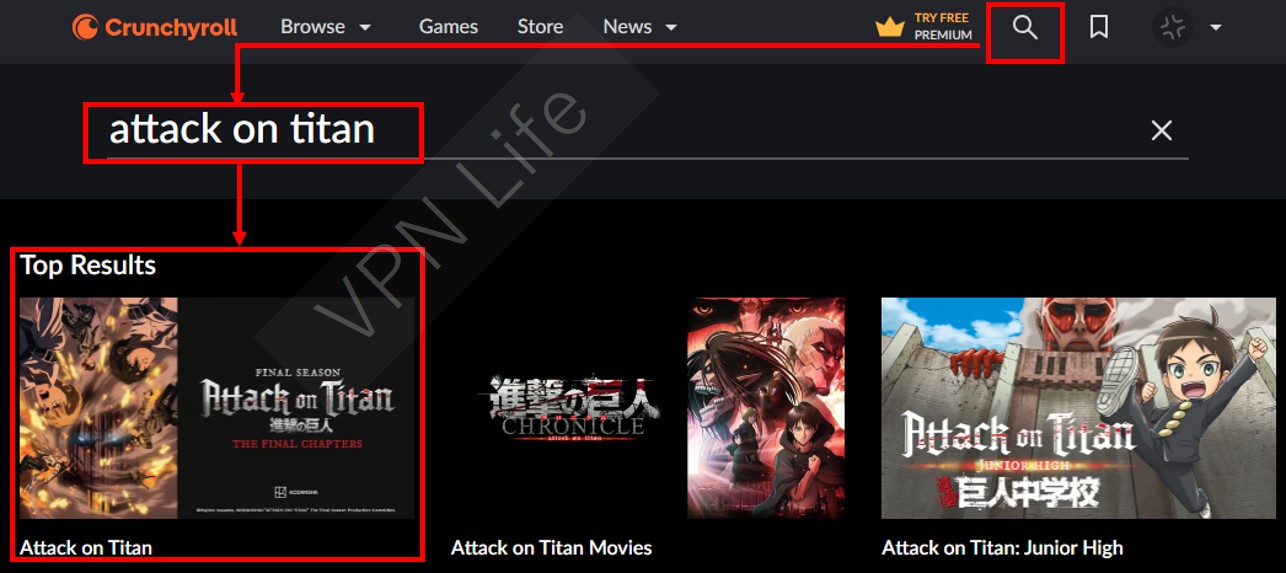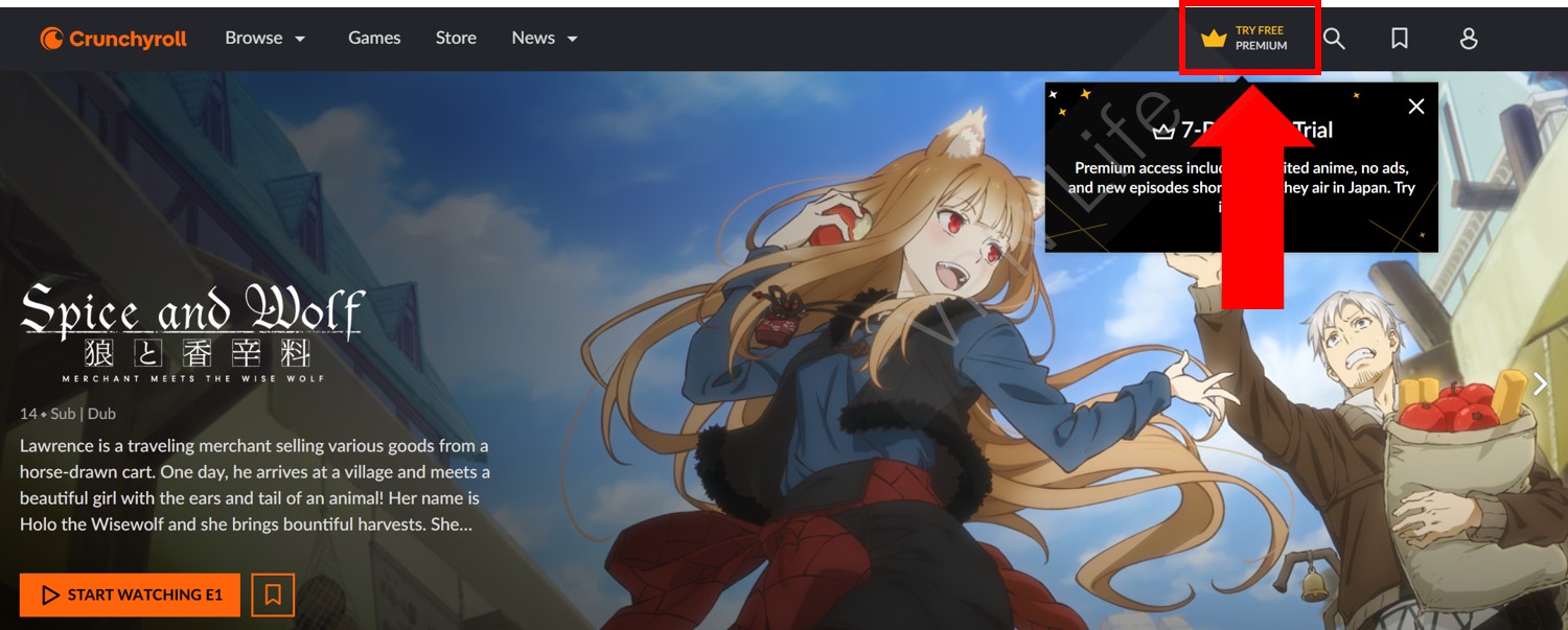 After accessing Crunchyroll, click the “TRY FREE PREMIUM” button.
