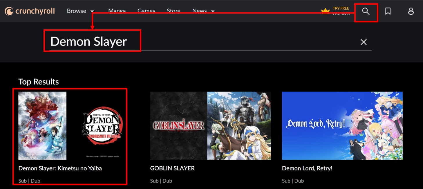 Click the search icon on the top of right and type “Demon Slayer” in the search box, you will be able to see Demon Slayer content.