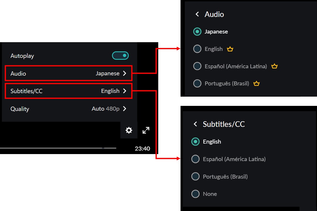 If you wish to change the subtitle settings, click on the icon at the bottom of the screen as shown below. A box labeled “Subtitles/CC” will appear. Click on this box to either change the language or turn off the subtitles. Note that changing the audio settings also requires a Premium membership.