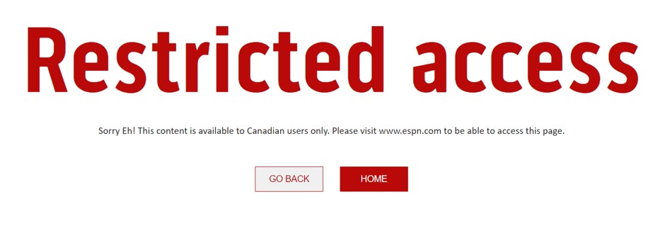 If you try to access the TSN website or app from another country, the service will detect your location based on your IP address and block you. You will then see an error message that says: “Restricted access. Sorry Eh! This content is available to Canadian users only“.