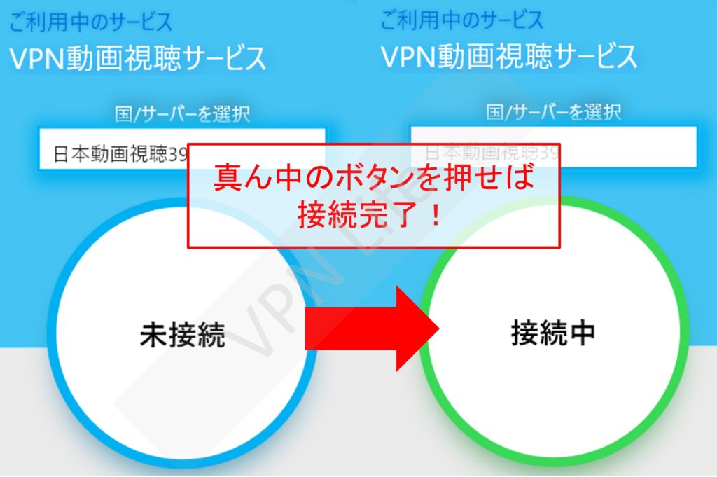 ボタンの表示が「接続中」に変われば、VPNサーバーへの接続は完了です。